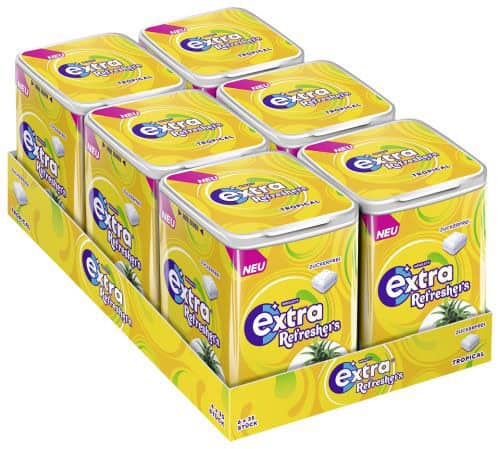Mit EXTRA Refreshers Tropical kommt fruchtige Exotik in den Alltag. Der tropische Geschmack sorgt für einen angenehm süßen Frischekick, wie ein kleiner Urlaub zwischendurch, nur eben zum Kauen.