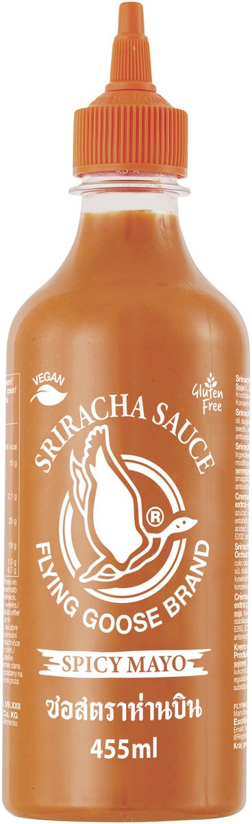 Die Flying Goose Sriracha Chili-Mayo scharf (455 ml) kombiniert cremige Mayonnaise mit der typischen, feurig-würzigen Schärfe der beliebten Sriracha-Sauce. Das Ergebnis ist eine aromatische, leicht pikante Sauce, die perfekt zu Burgern, Pommes, Sandwiches, Bowls, Sushi, Fleisch- und Fischgerichten passt.