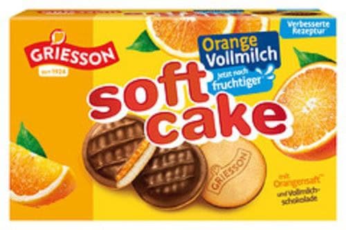 Der GRIESSON Soft Cake Orange Vollmilch verbindet einen lockeren Biskuitboden mit einer fruchtigen Orangenfüllung und einem Überzug aus zarter Vollmilchschokolade. Das Ergebnis ist ein besonders harmonischer Geschmack: frische Zitrusnote trifft auf cremige Schokolade, ein Klassiker mit extra Schmelz.